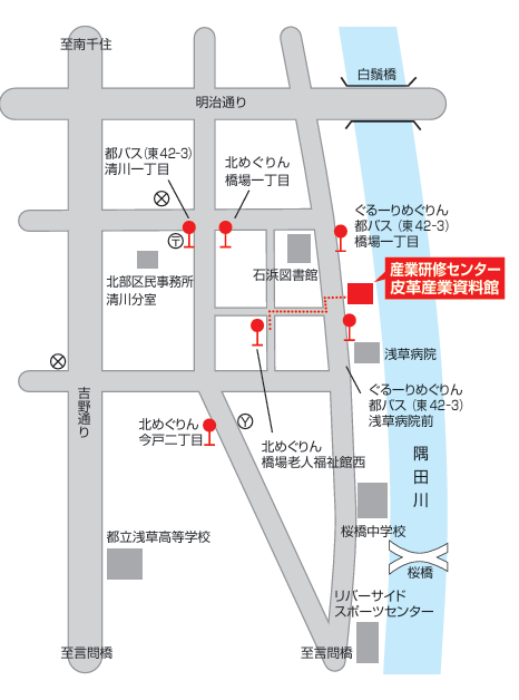 ・松屋デパート江戸通り側バス停より、南千住行き都バス42乙系統乗車、「浅草病院前」下車、徒歩 8分