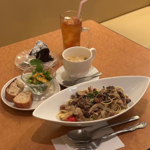 1,400円の日替わりランチ(パスタやご飯ものなど、サラダ、パン)+スープ、デザート、コーヒーor紅茶