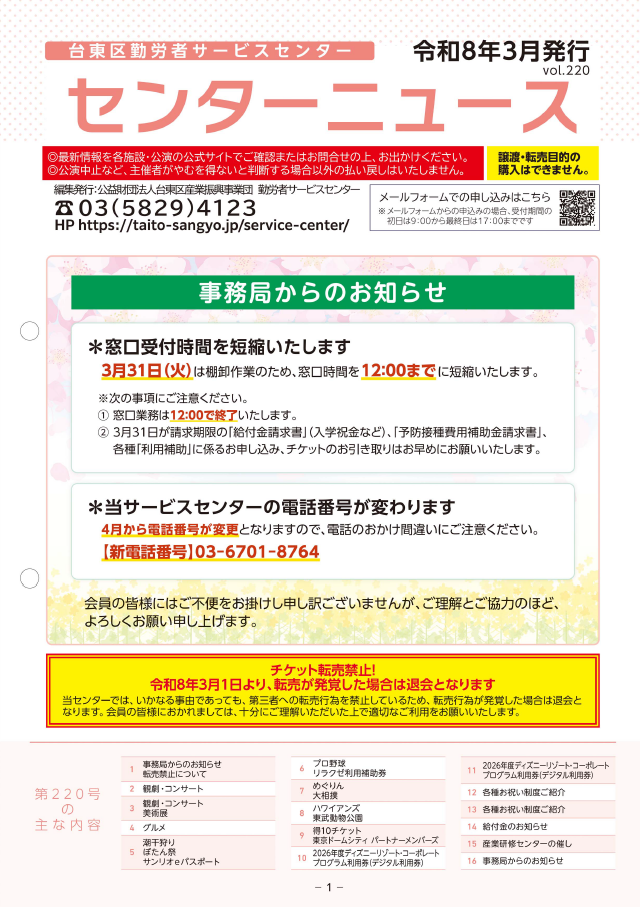 例年3月号には上記2の利用補助券の他に「各種届出用紙/チケット申込はがき」を同封いたしておりましたが、本年は同封しておりません。各種届出用紙はHPからダウンロードしていただくか、またフォームから届出や申請ができるサービスもございますので、ご利用ください。