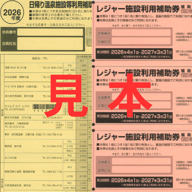 2026年度施設利用補助券を同封いたしました。再交付はできませんので、大切に保管の上、ご利用ください。内容は「日帰り温泉施設等利用補助券」(12枚)、「レジャー施設利用補助券」(6枚)です。
