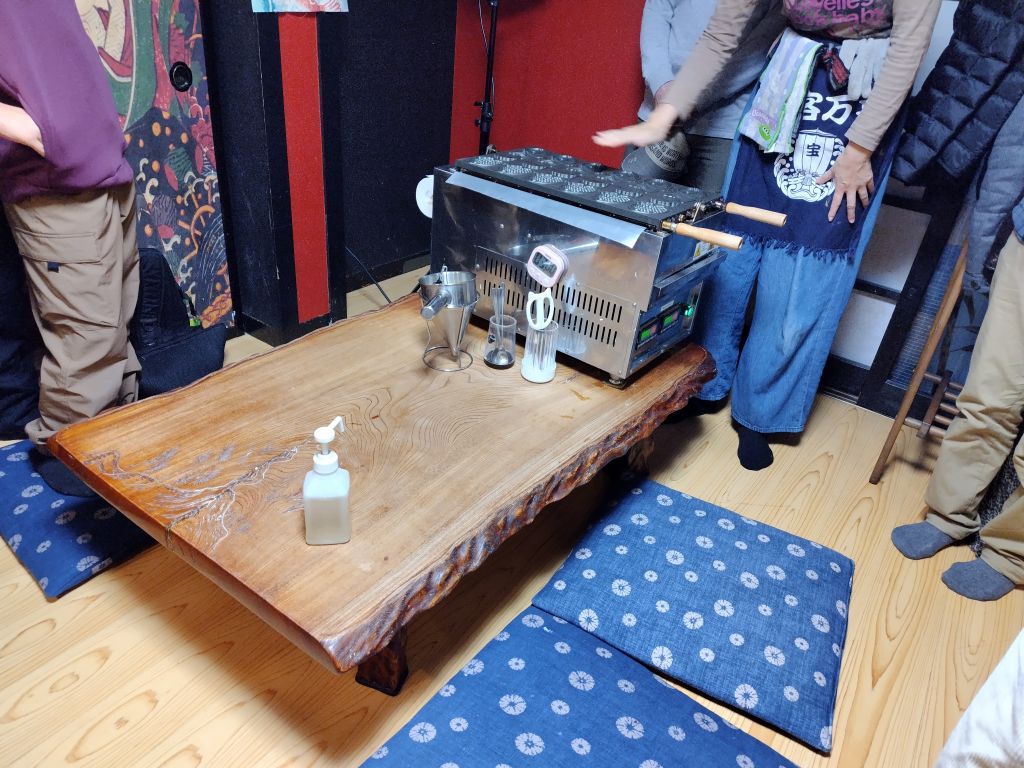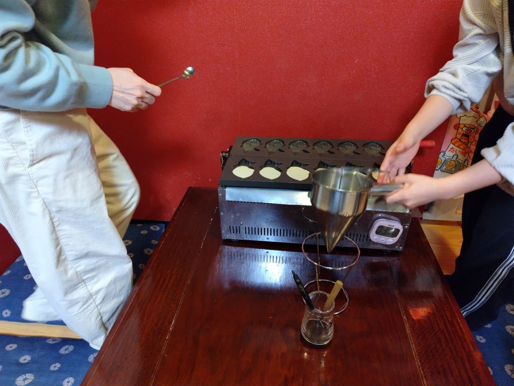 今回は自分を除き、ご夫婦や親子でしたが、鉄板は熱くなっているので、焦がさないためにも生地や具材を入れたり延ばしたりを素早く行う必要があります。その意味でも二人ペアがベストかなと。