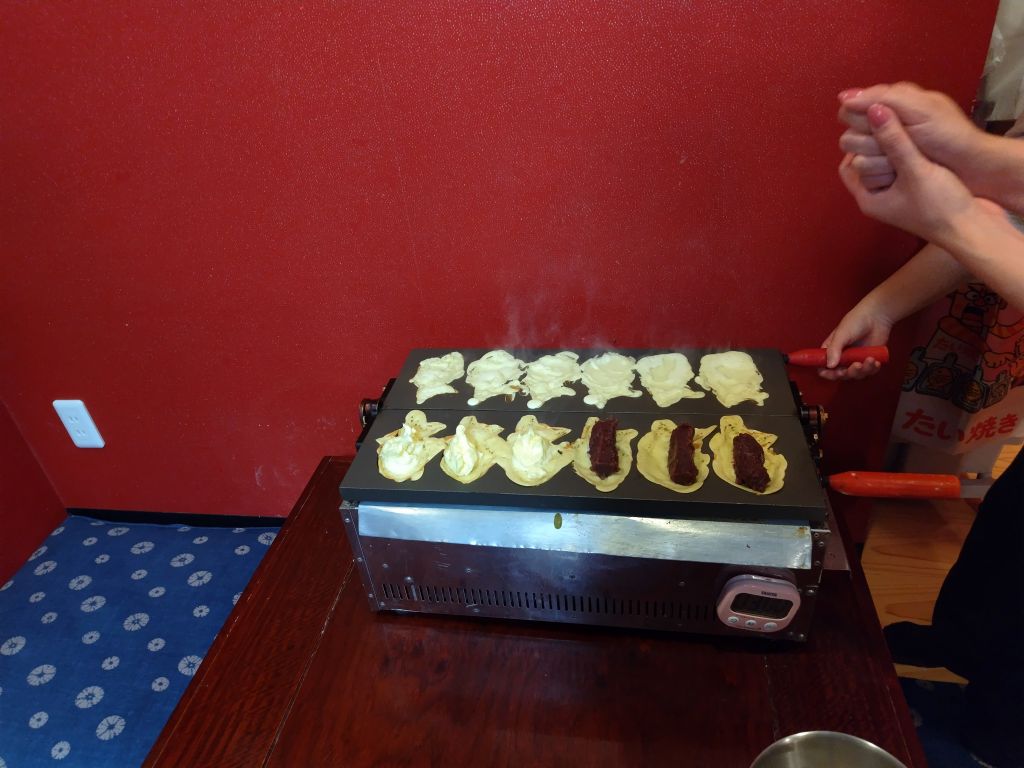 求楽さんの『たい焼き体験🄬』はインバウンドの方にも人気があり、この日も前の体験グループには外国人の方も何名か。
